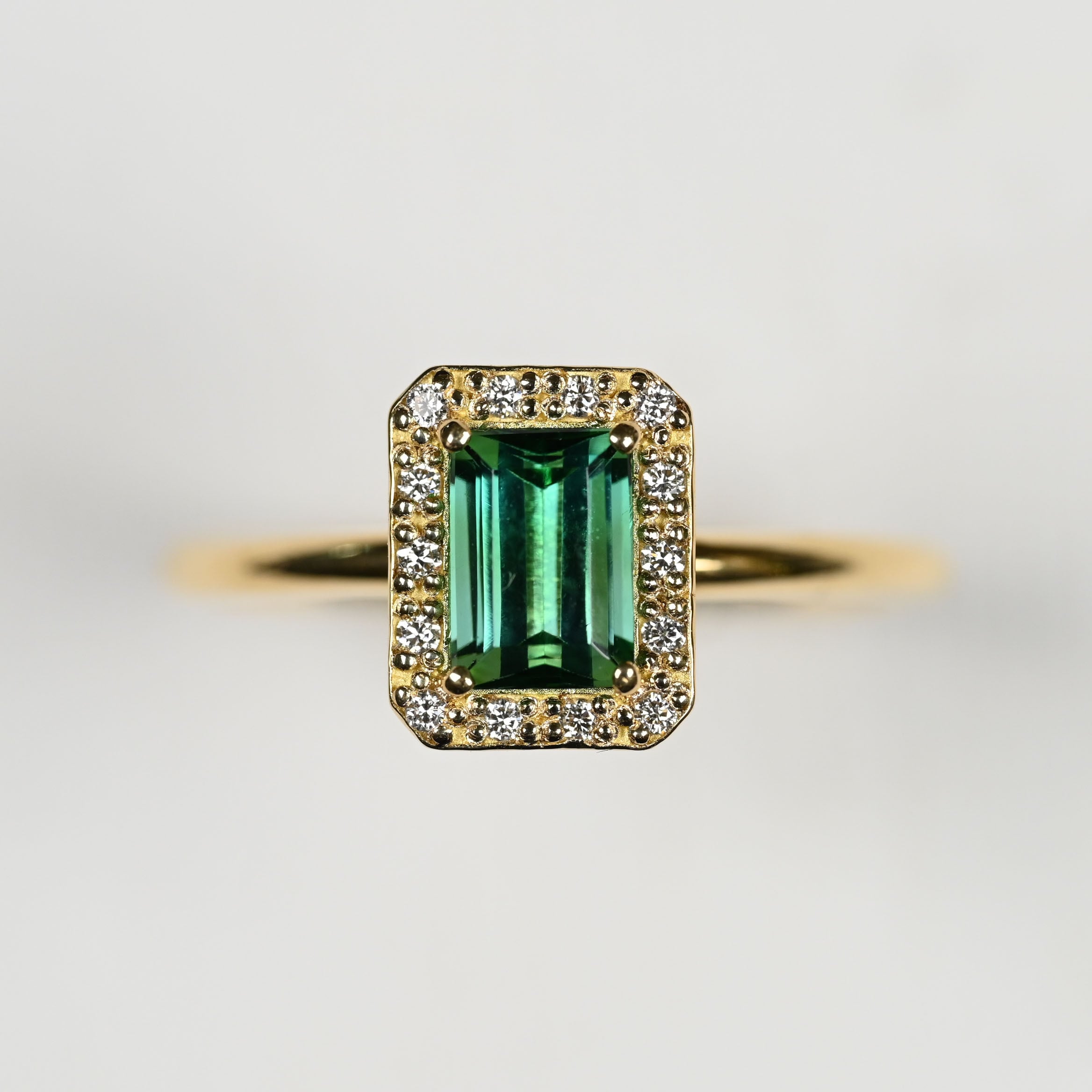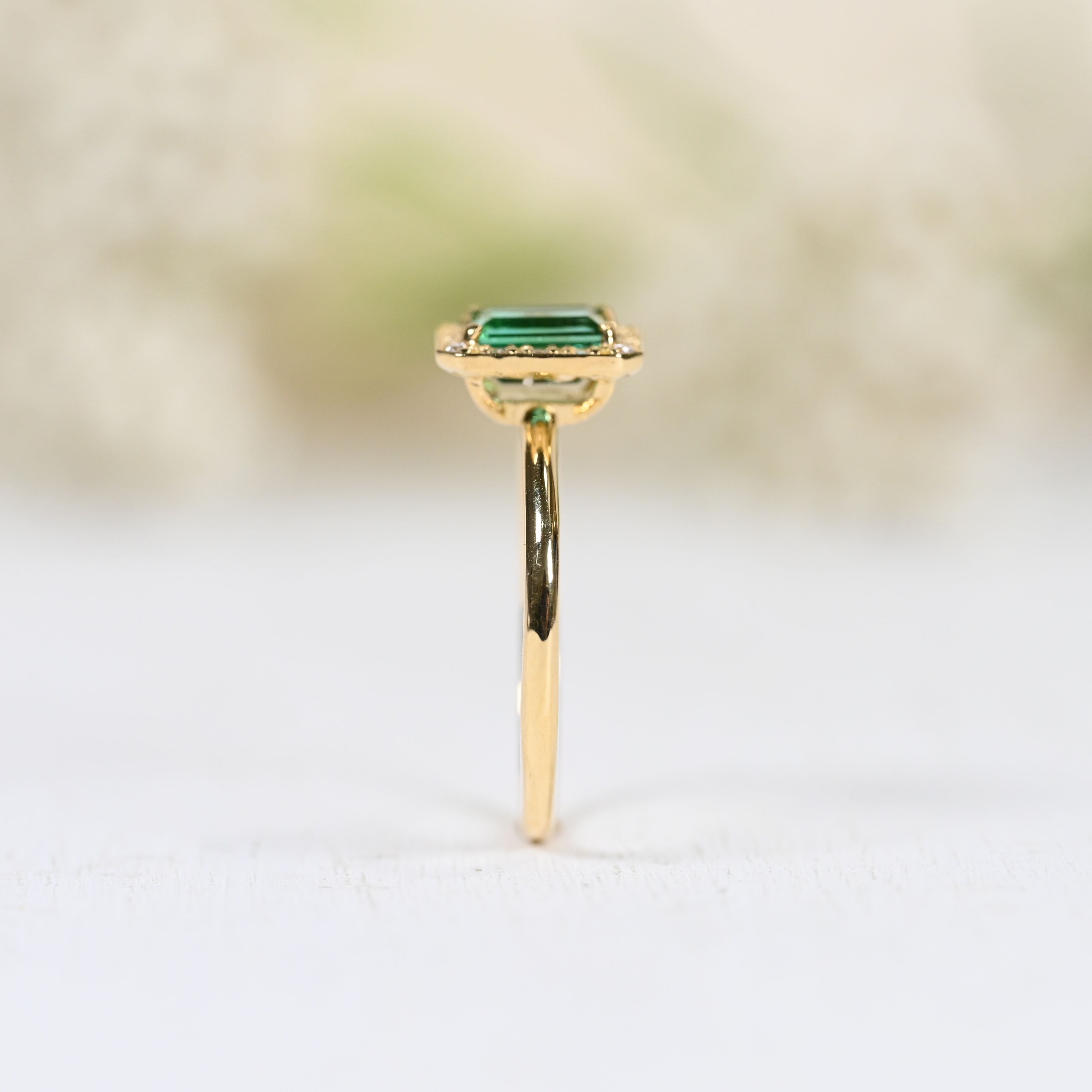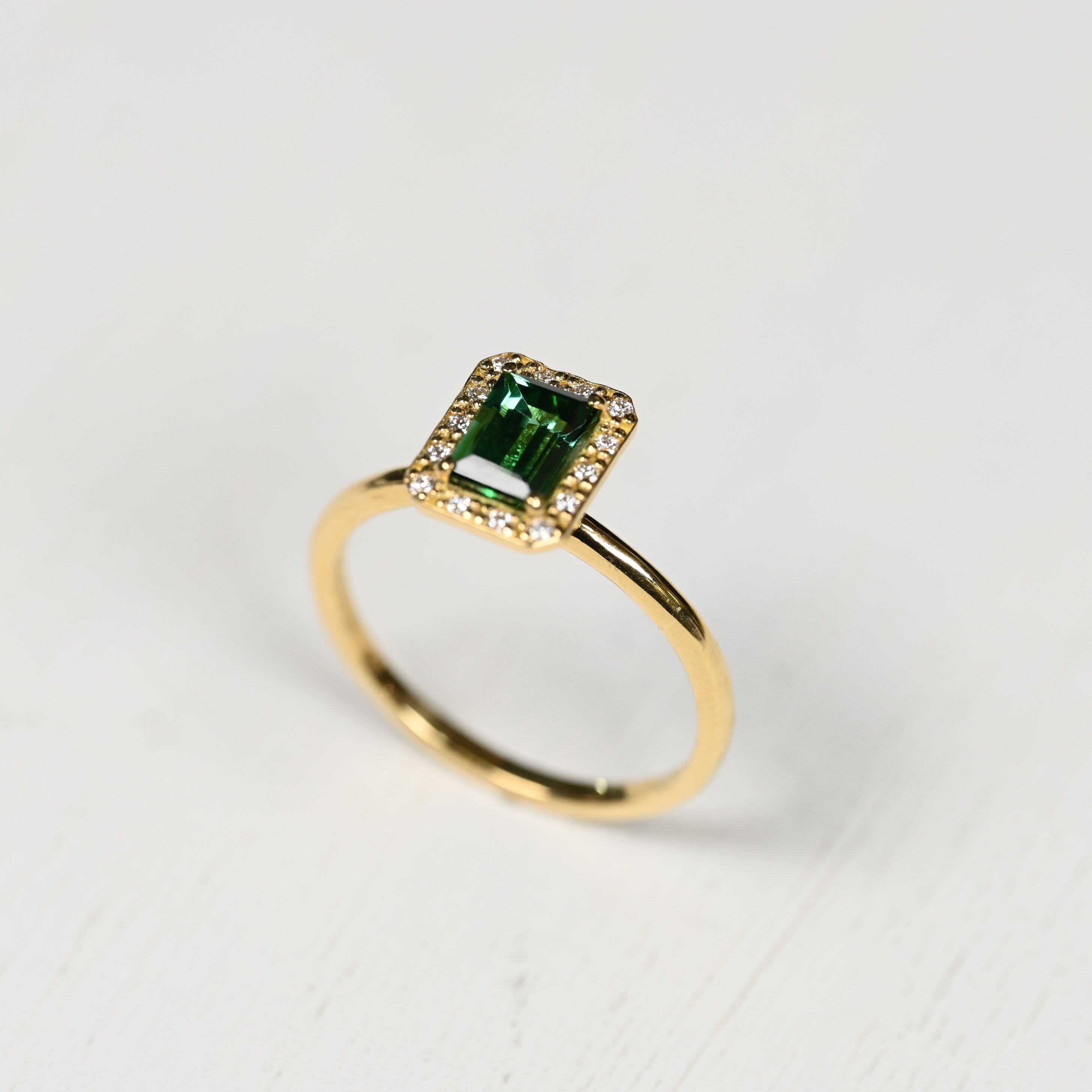大粒でグリーンのルースを取り巻きのアームシンプルなリングと合わせました