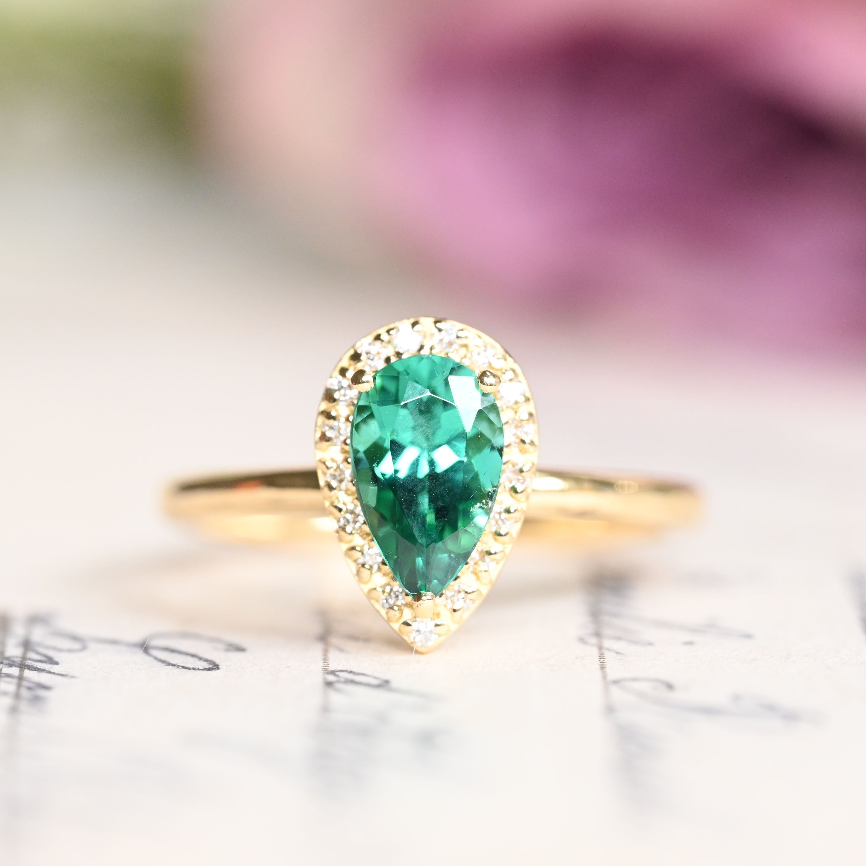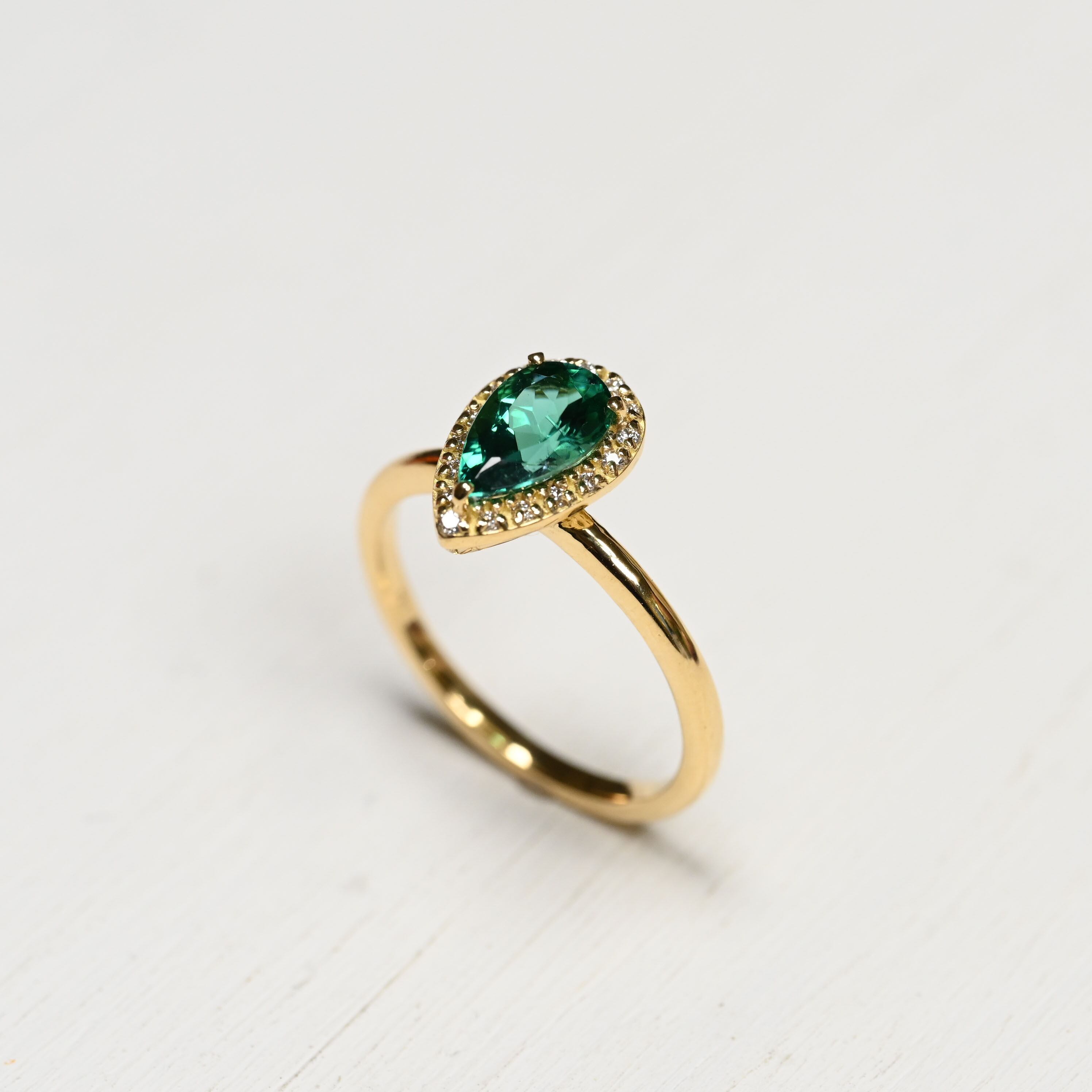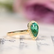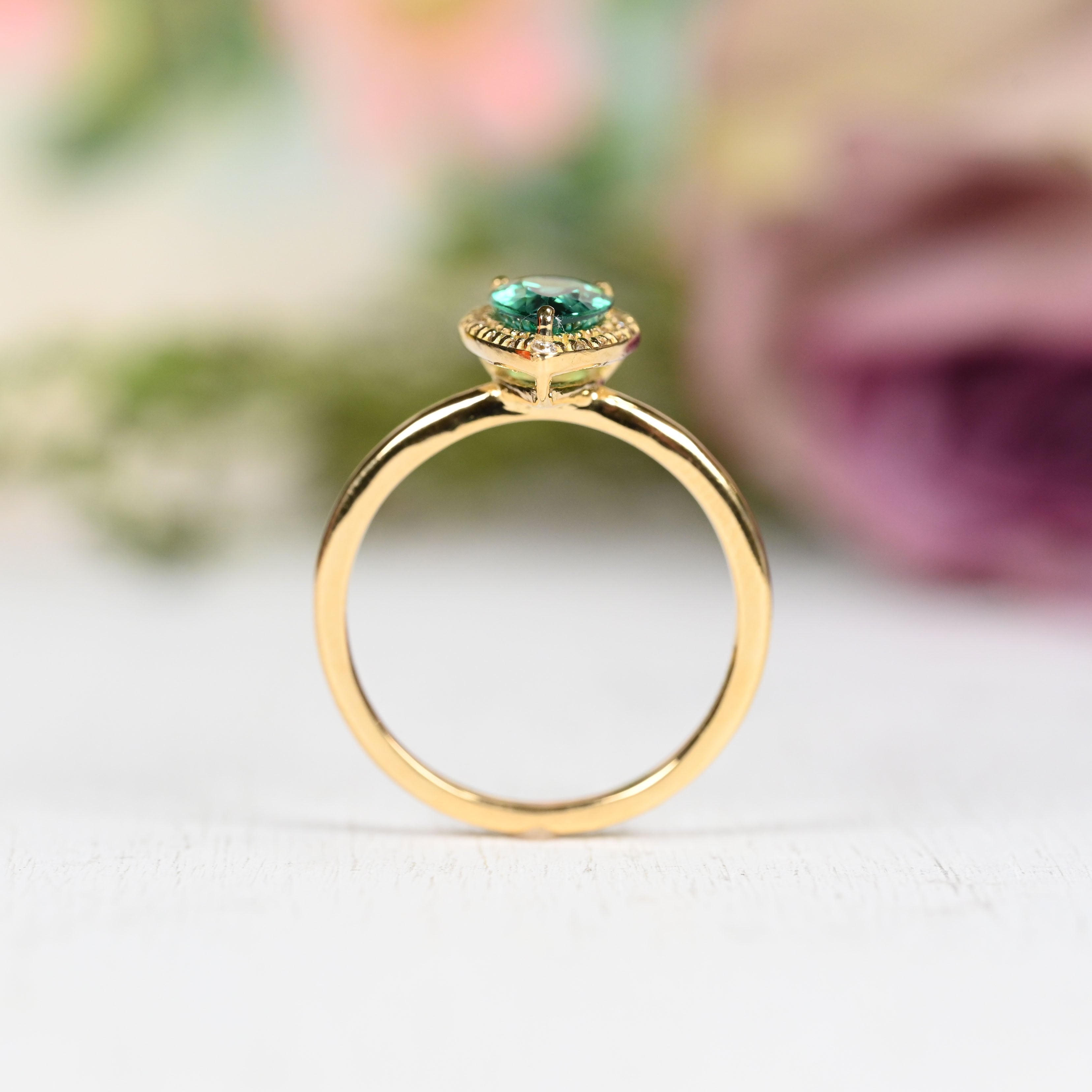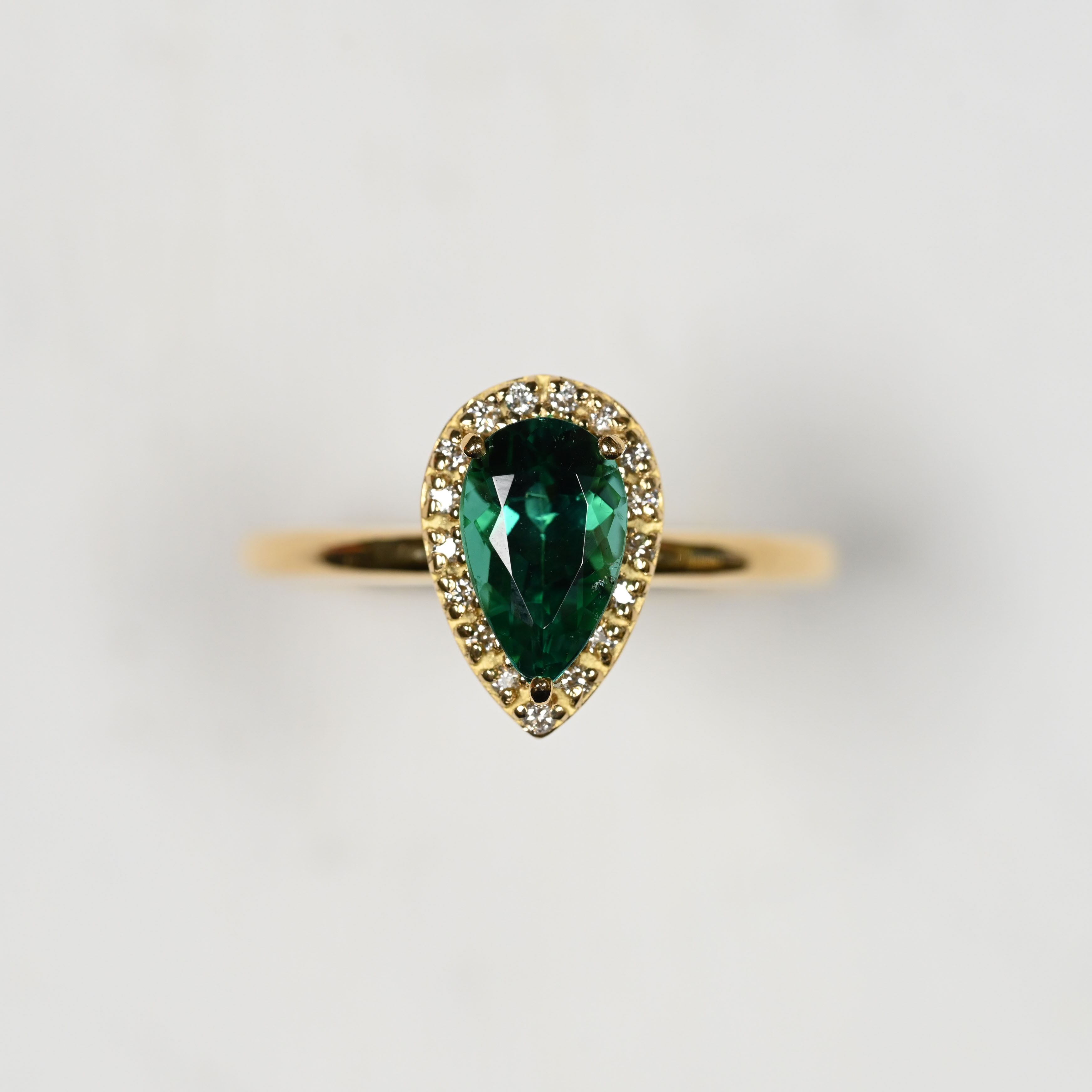 大粒でテリの良いグリーン濃いめのルースをダイヤモンドで取り巻き、アームはシンプルなリングと合わせました