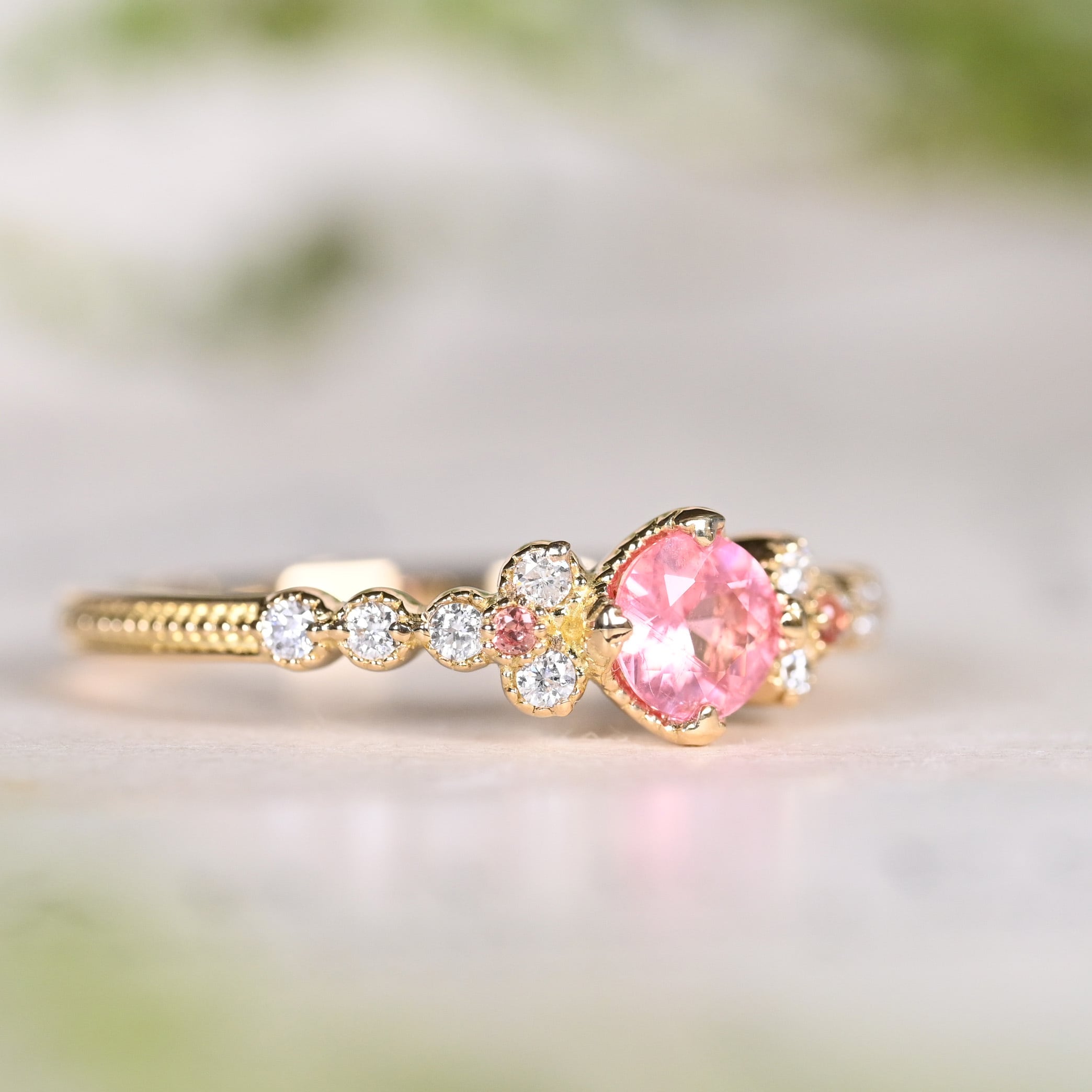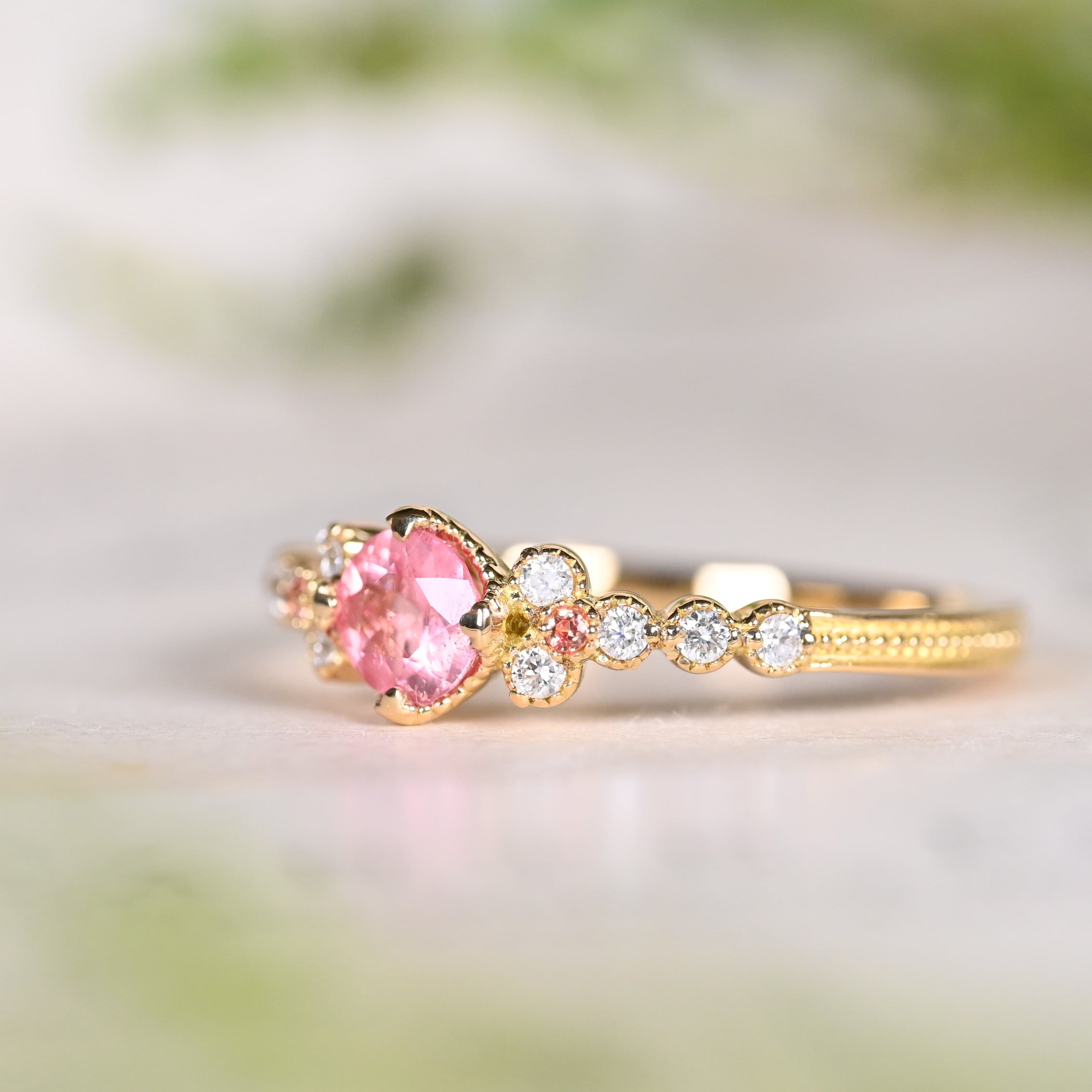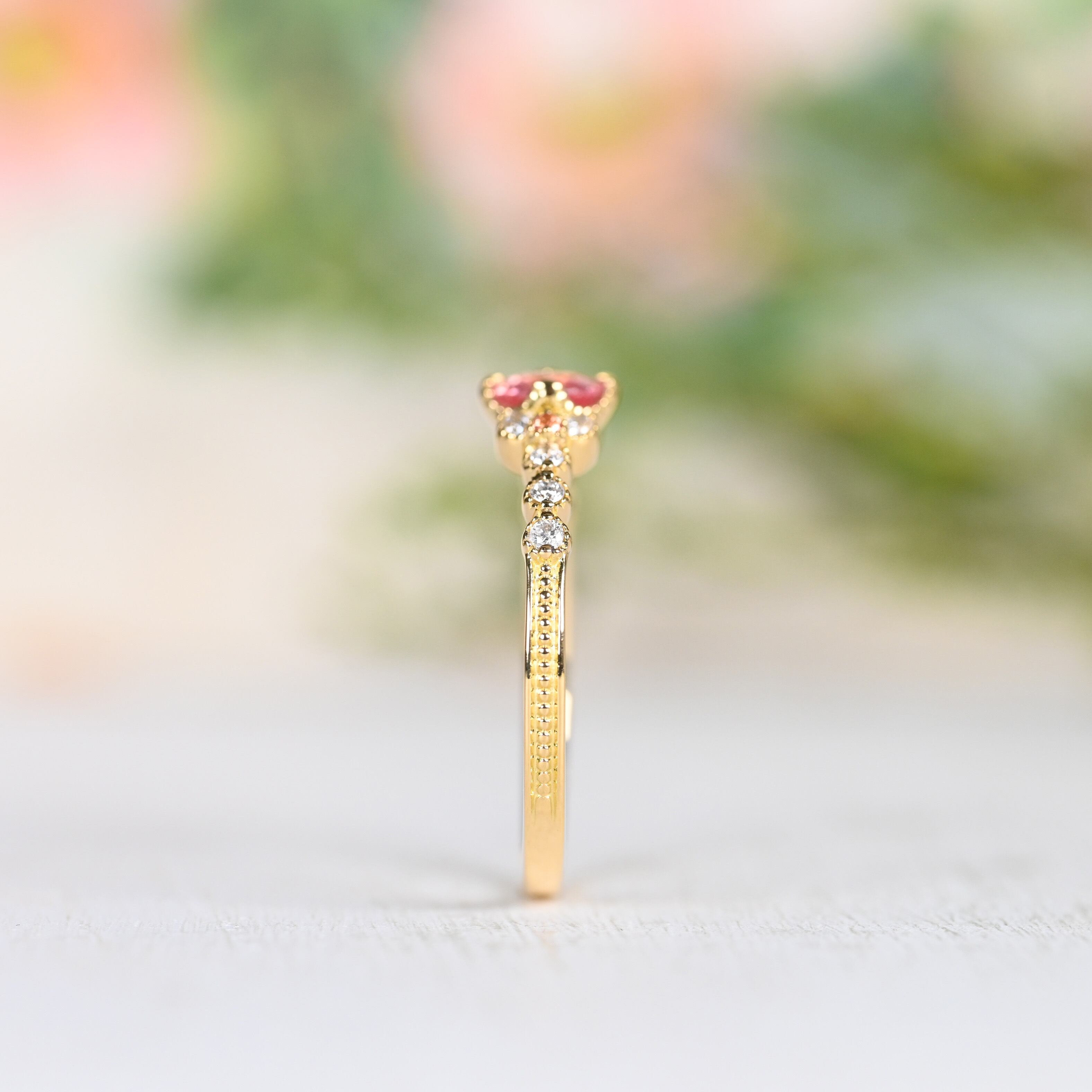 両サイドにはお花のようにダイヤが留まり、その中心にはオレンジサファイアをあしらいました♪