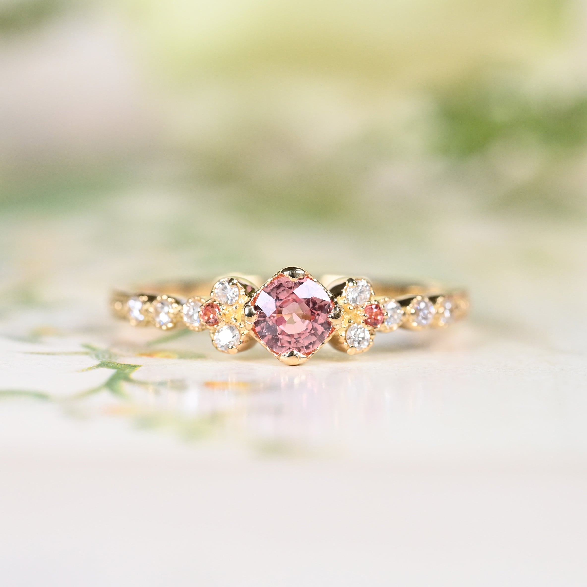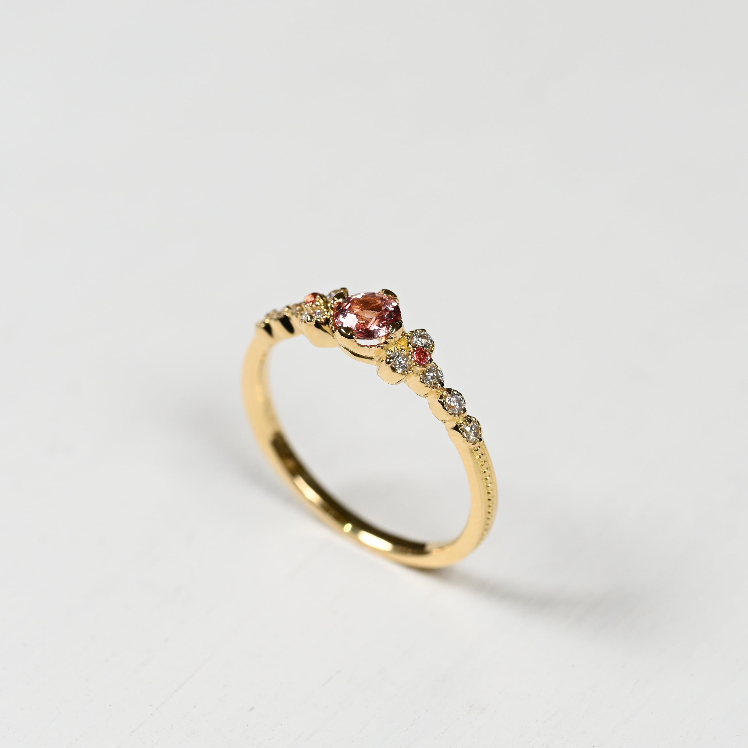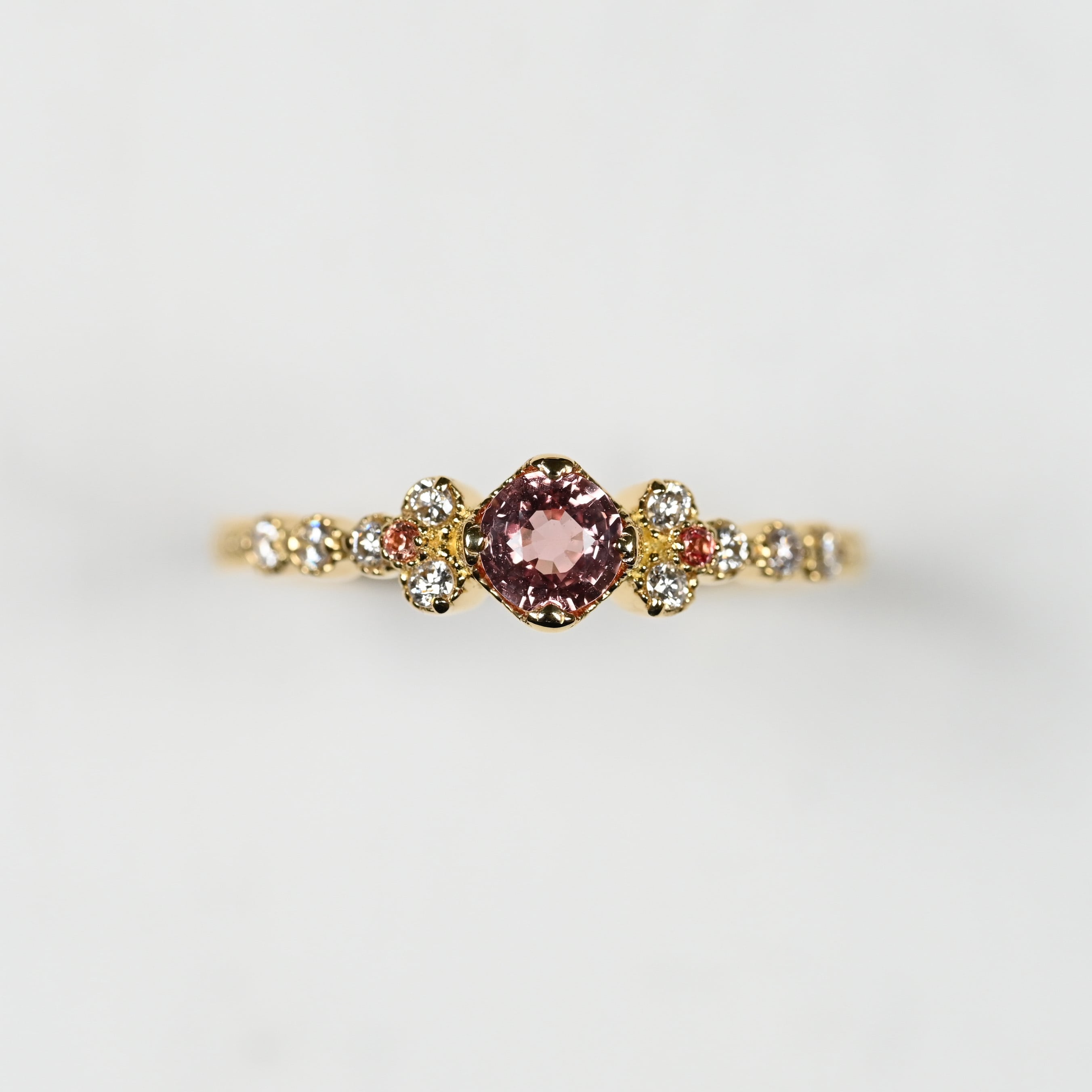 両脇に煌めくダイヤモンドと小さなオレンジサファイアをあしらい、クラシカルでありながら大人可愛い雰囲気を纏ったリングに仕上げました
