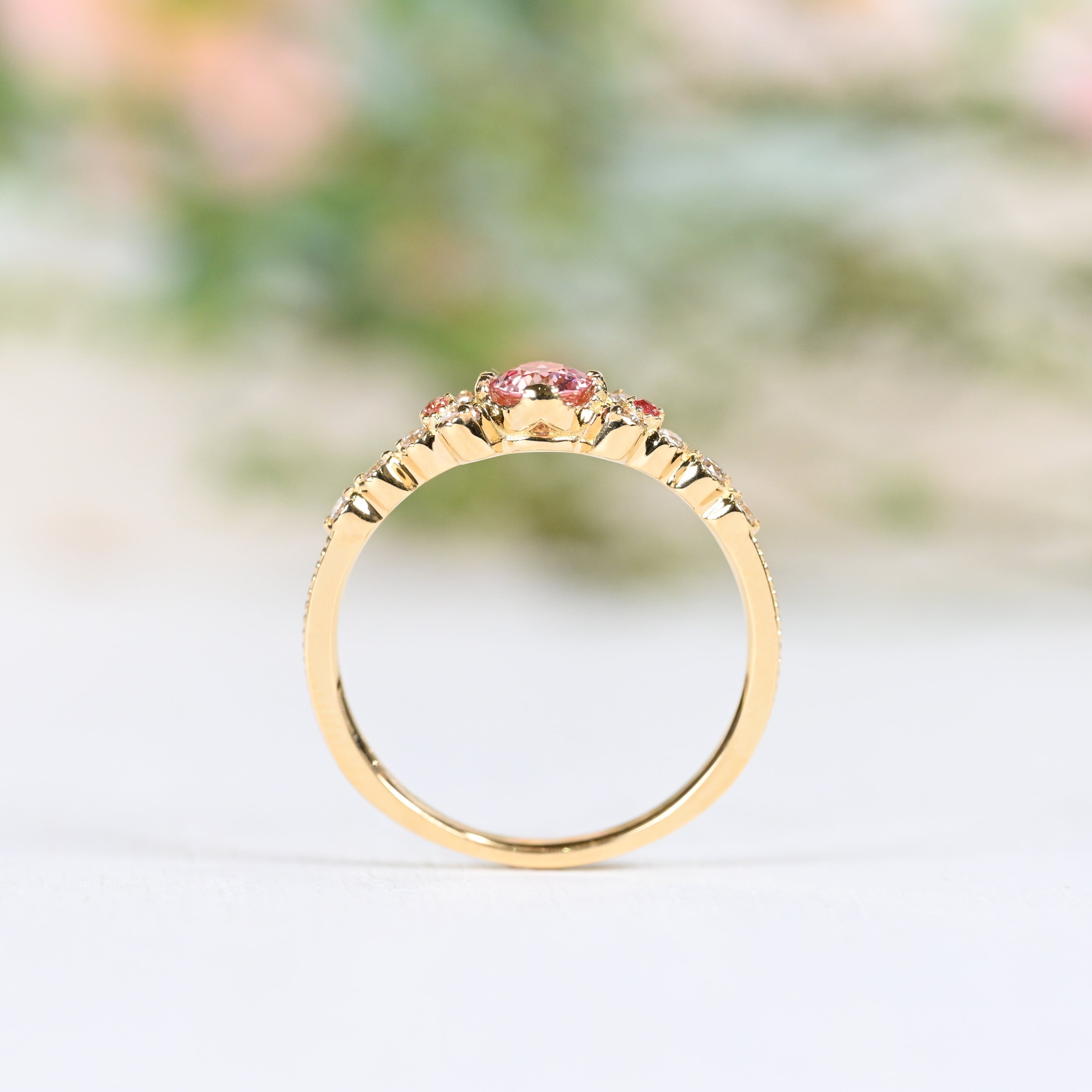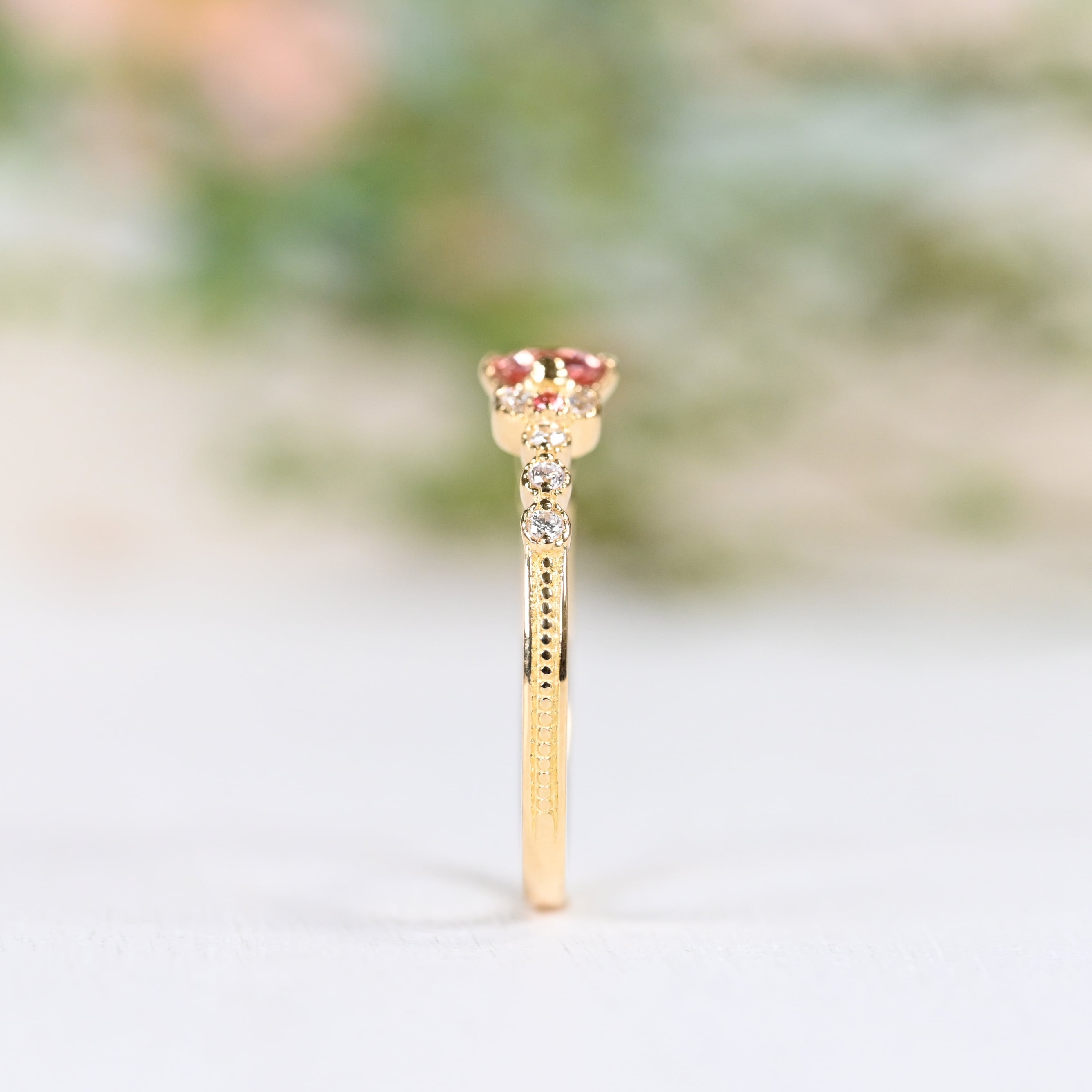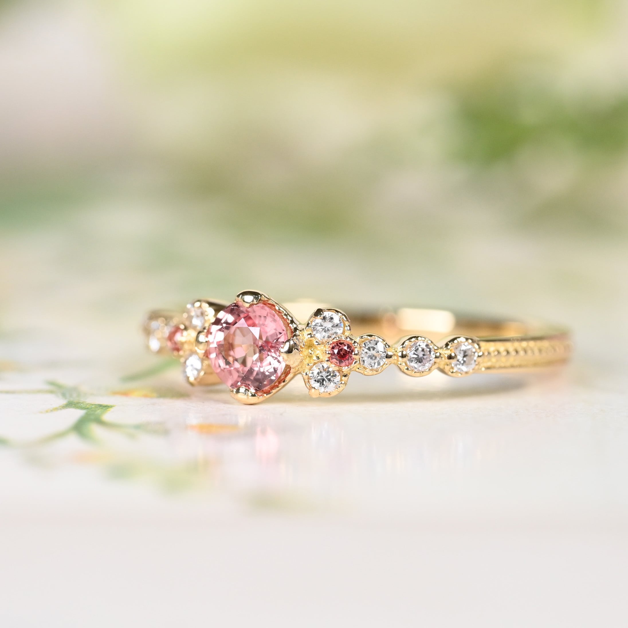 両脇に煌めくダイヤモンドと小さなオレンジサファイアをあしらい、クラシカルでありながら大人可愛い雰囲気を纏ったリングに仕上げました