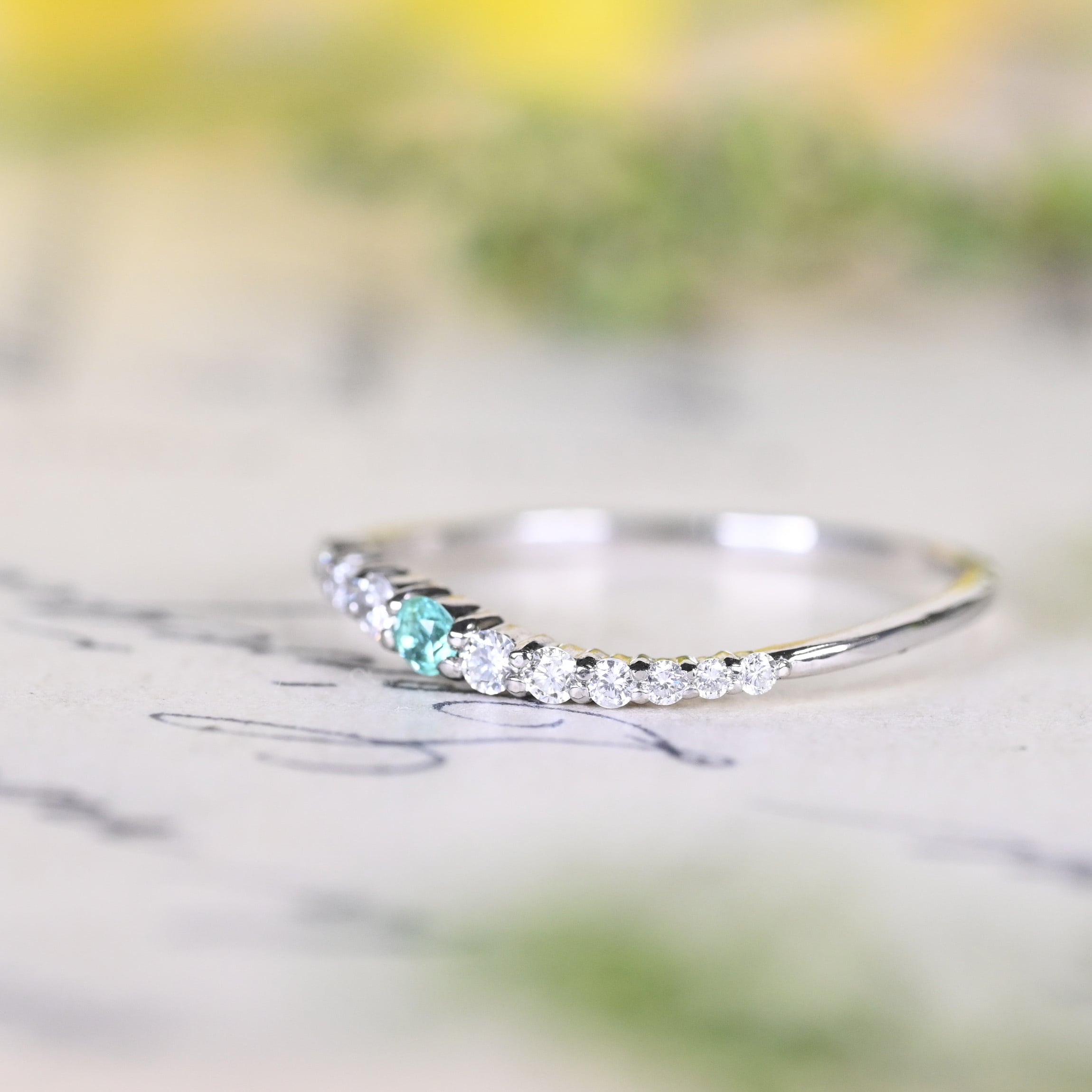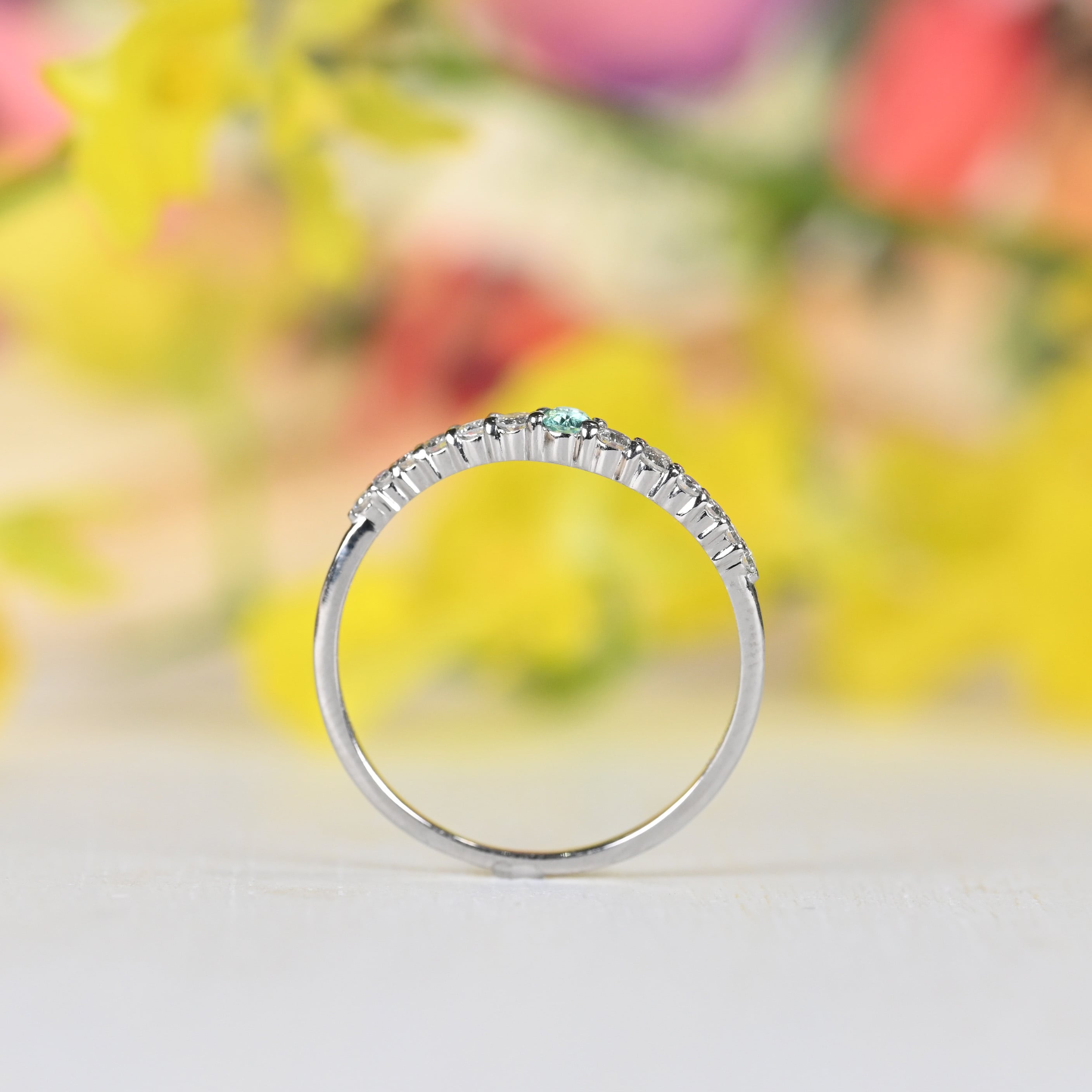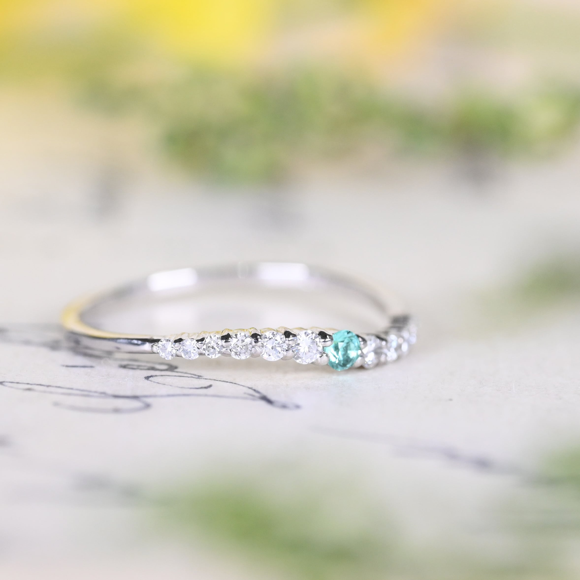 パステルトーンの小粒でも美しいネオンブルーグリーンのパライバトルマリンを流れるようなウェーブラインとダイヤモンドの煌めきが美しいリングで仕立てました