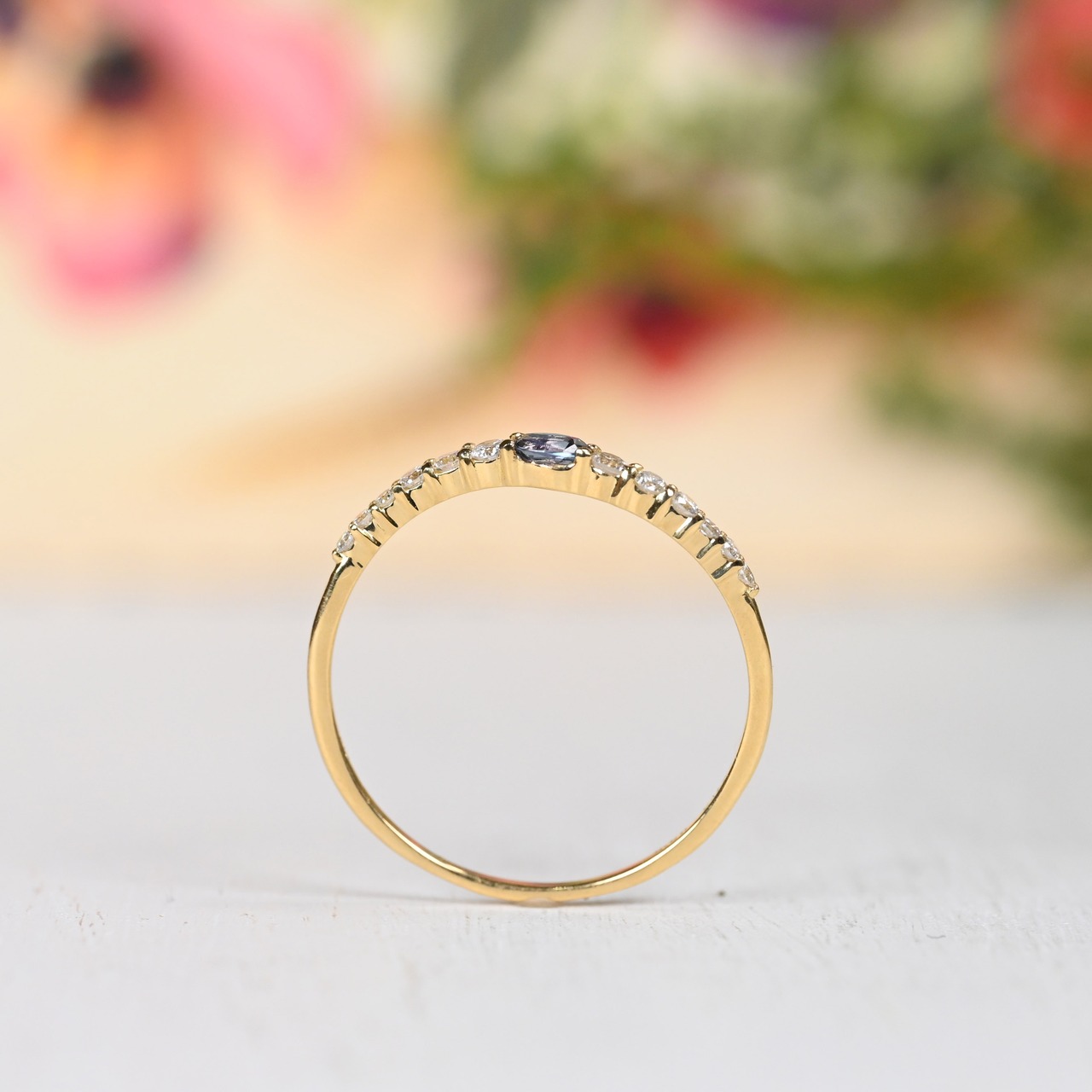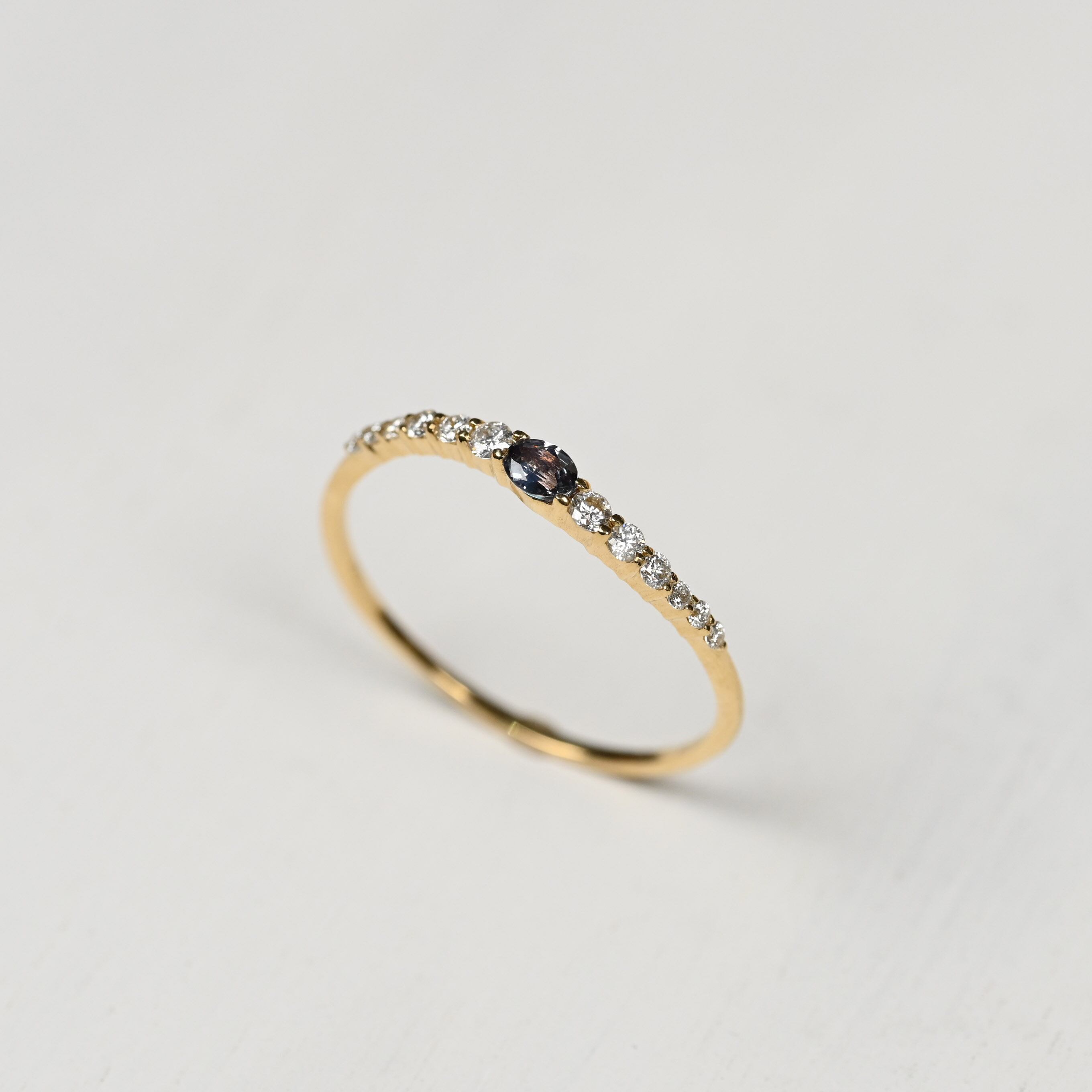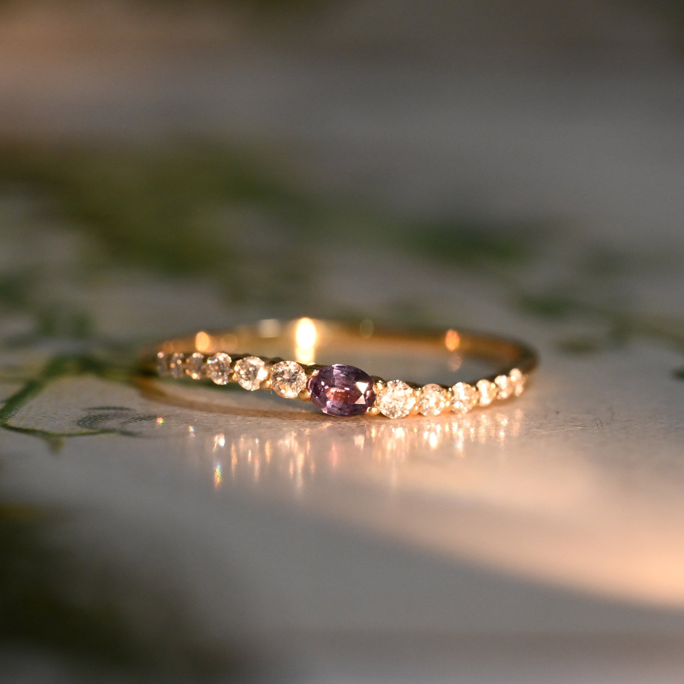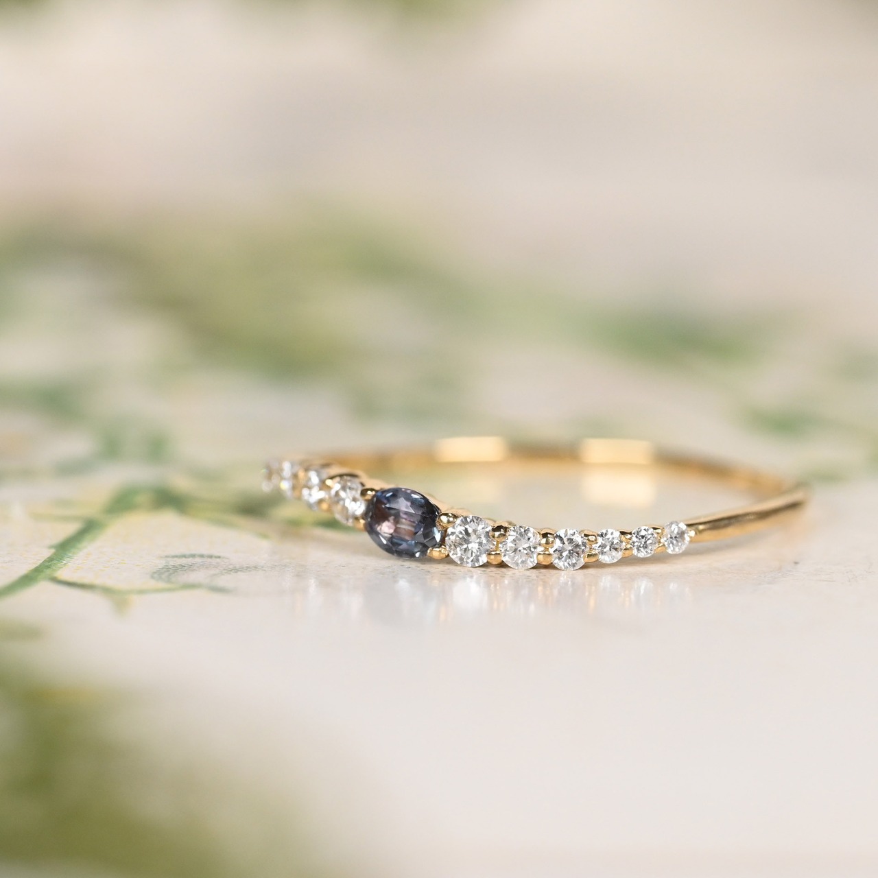 アレキサンドライト自体と指に添うダイヤモンドのラインの美しさを両方楽しめるリングです