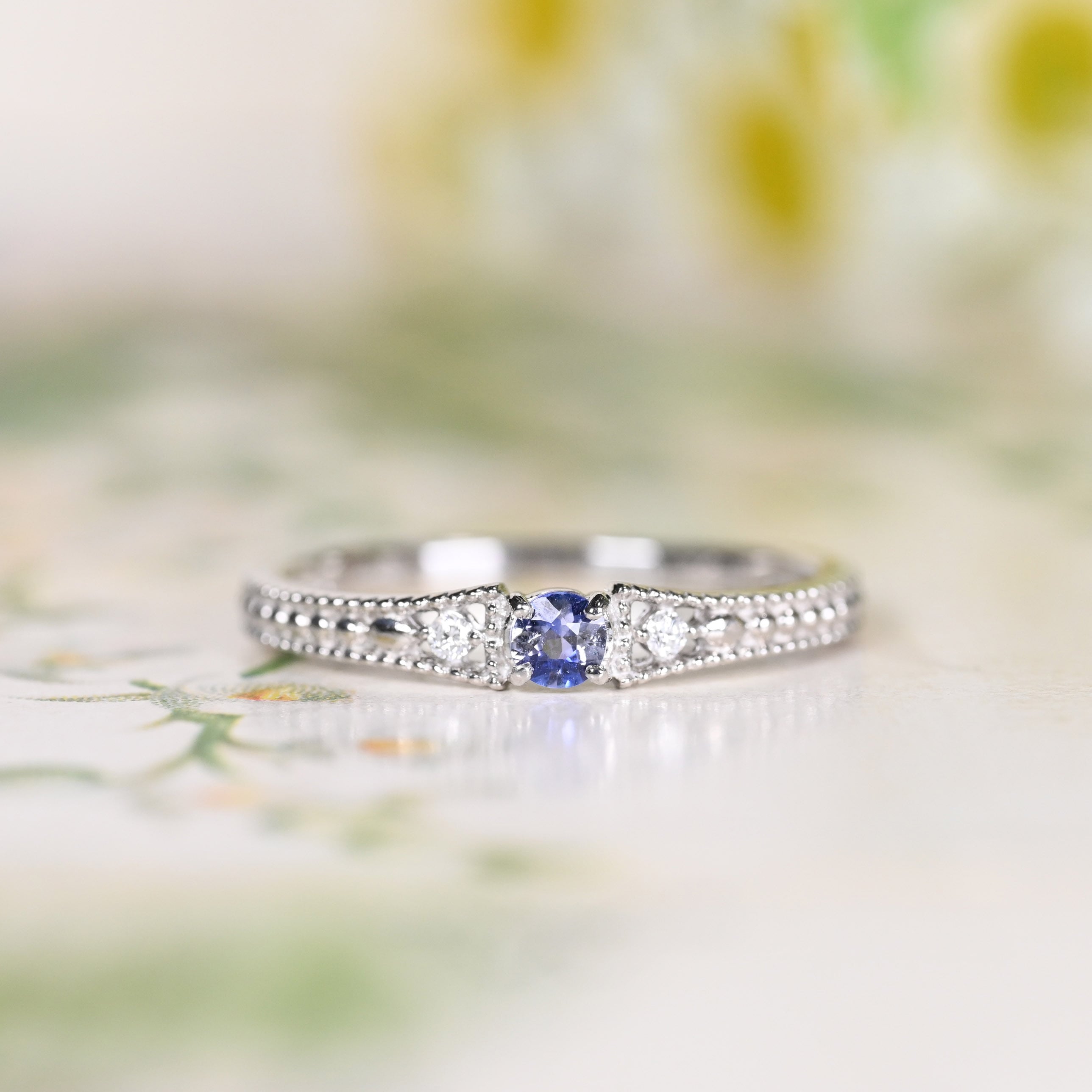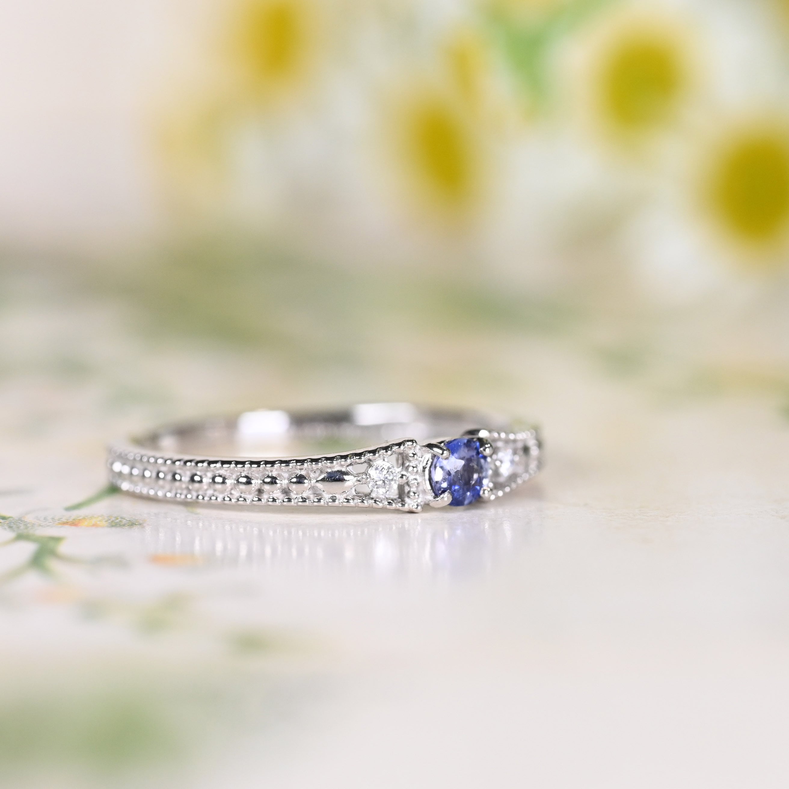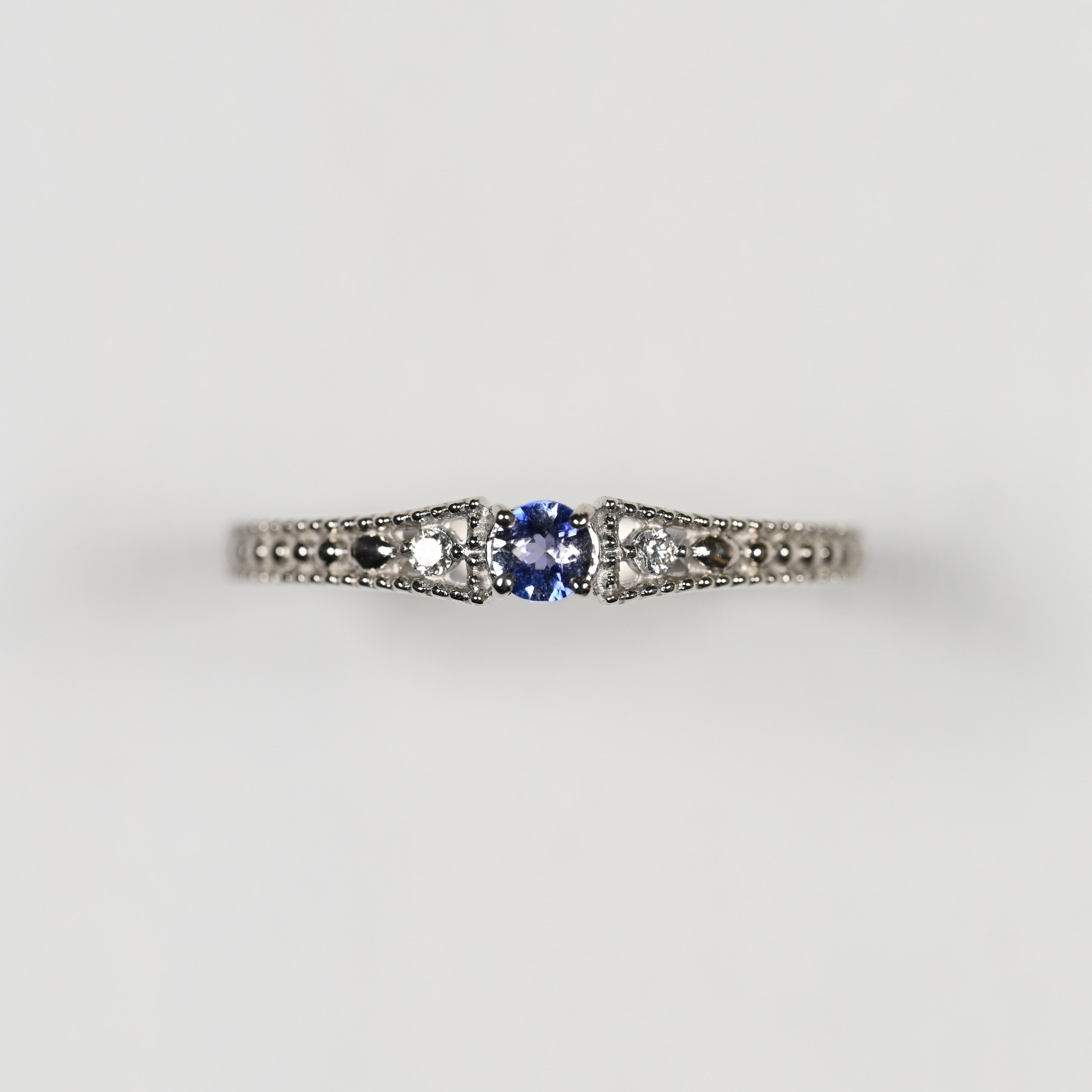 青紫色の美しいお石を地金しっかりめでミルのデザインが印象的なリングでお作りしました♪