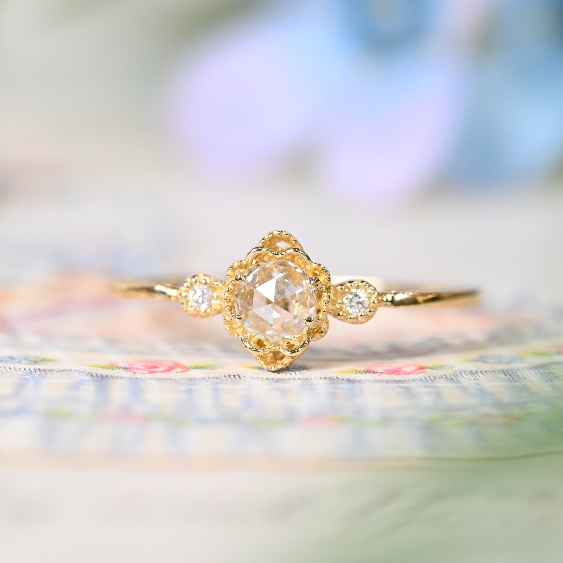 ローズカットのうるうるな輝きと花開いたような石座のデザインが可愛い