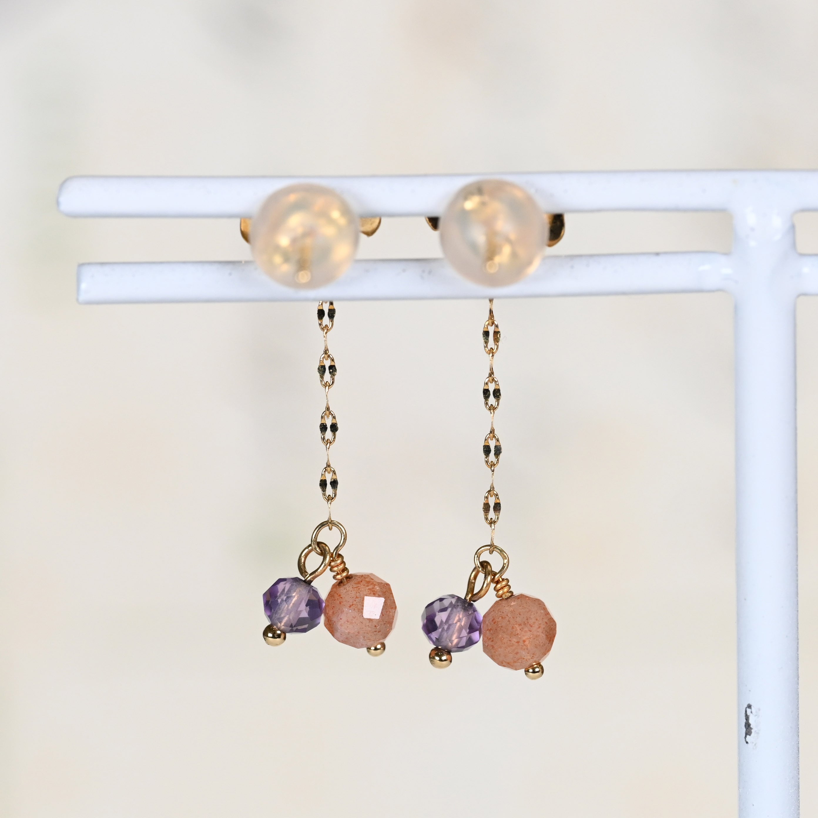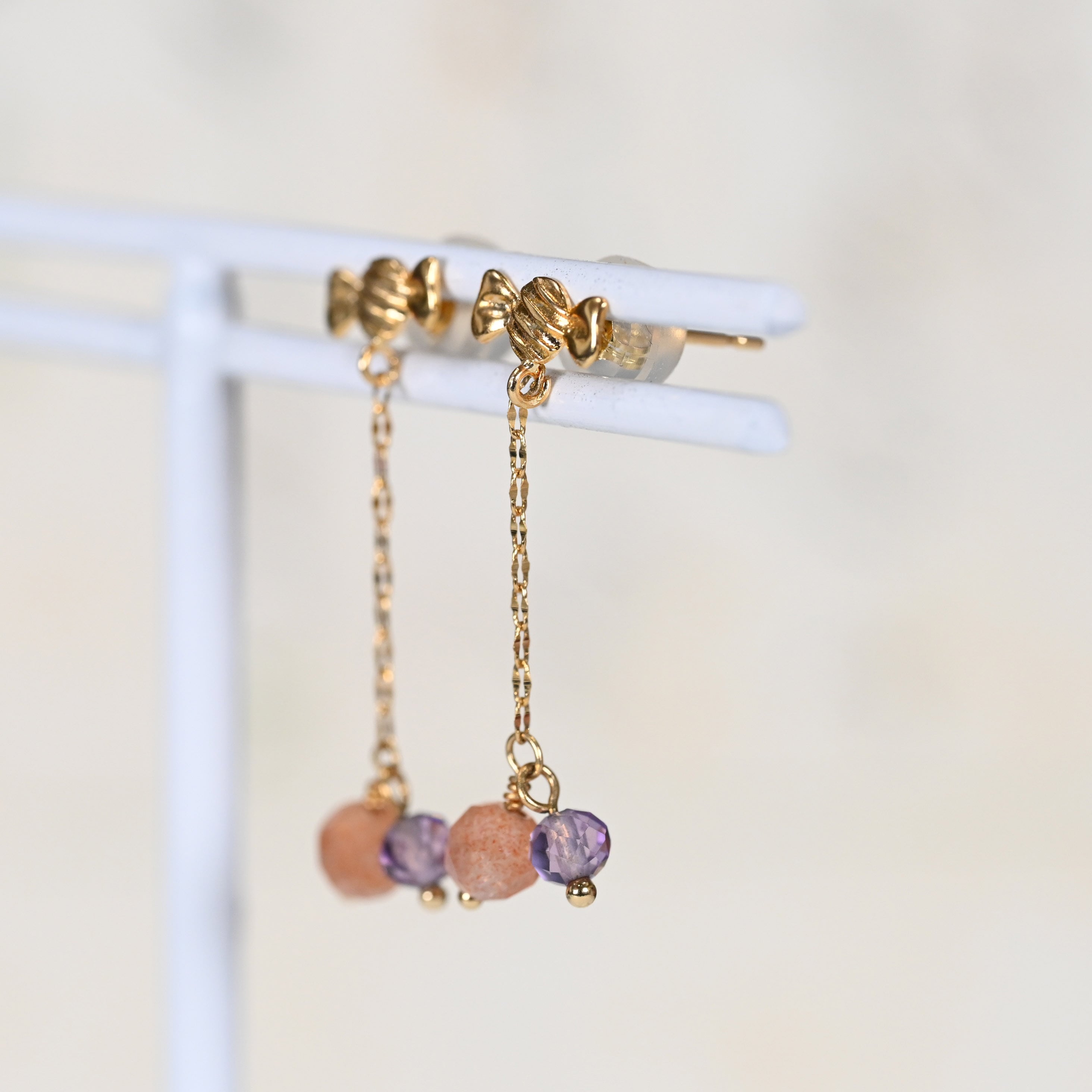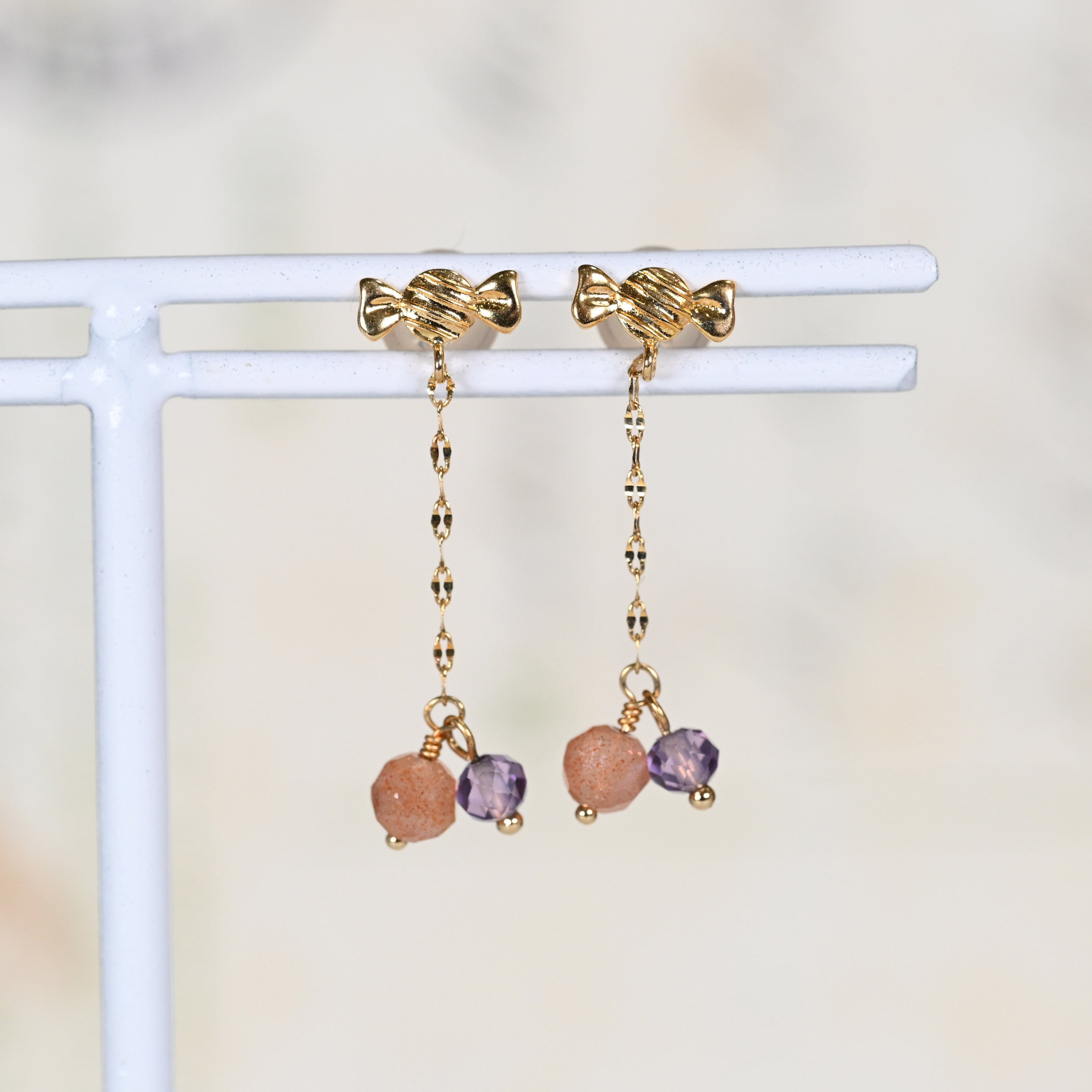 キャンディの下にはキラリと輝くプレシャスチェーンと小粒パステルカラーのサンストーンとアメジストがゆらゆら揺れるデザイン
