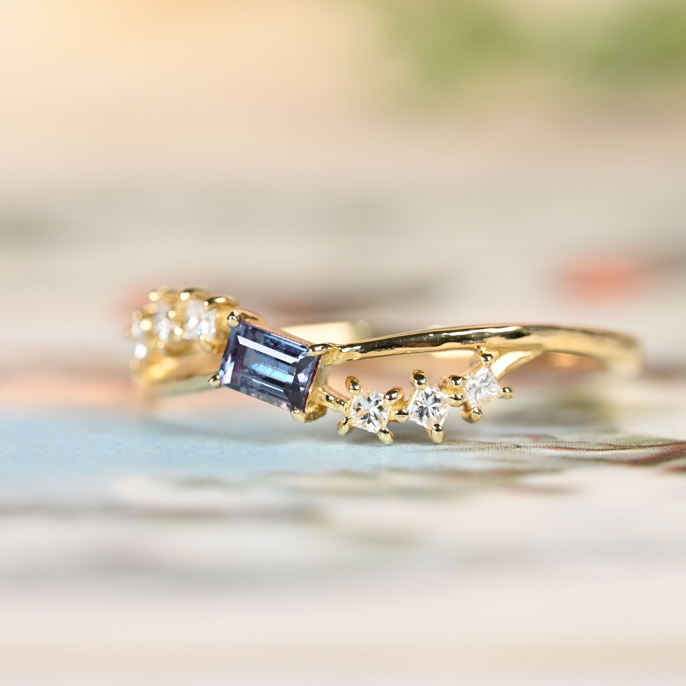 バゲットカットのアレキサンドライトをダイヤモンドのラインの流れのままお石を斜めに留めたバージョンです