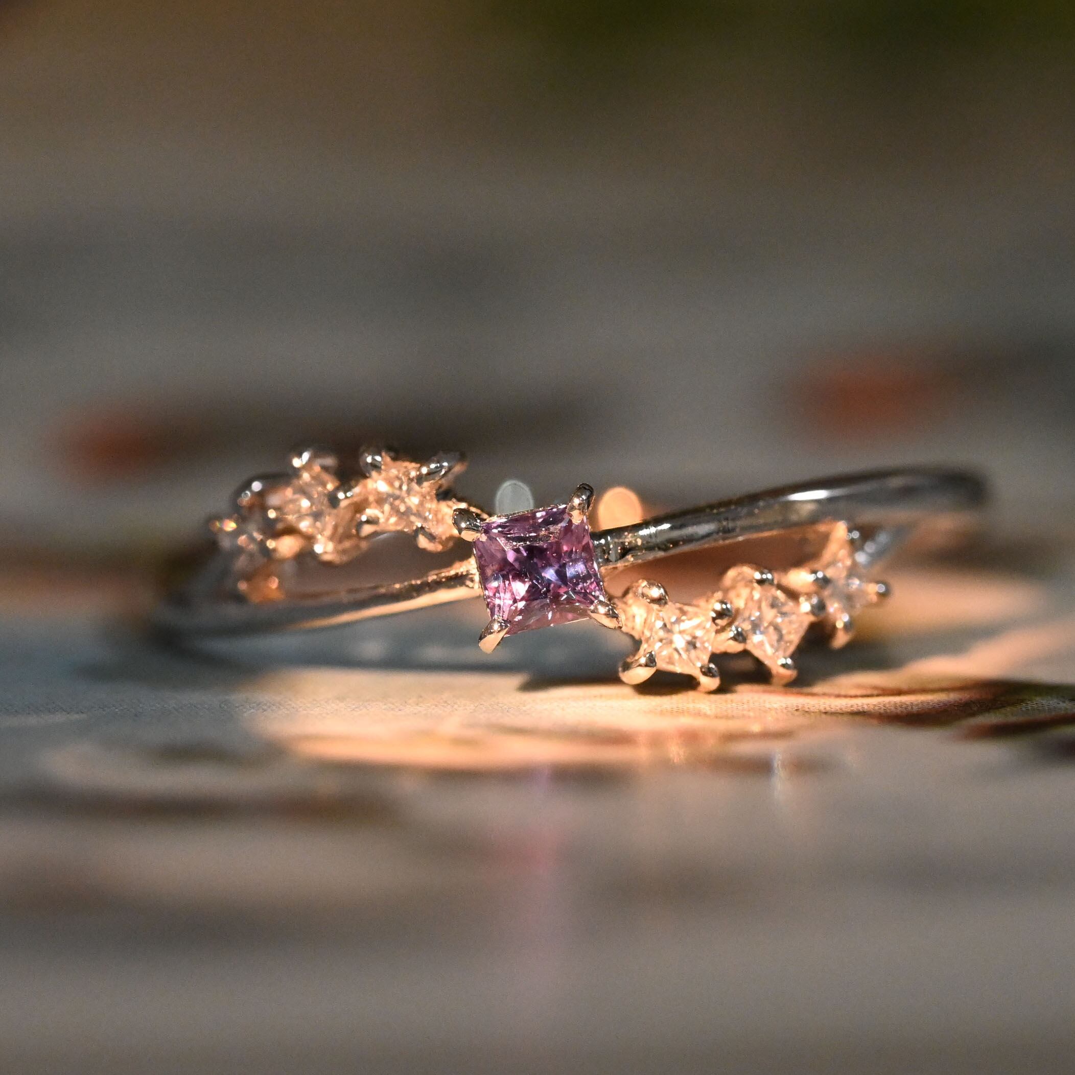 通常ラウンドカットのダイヤモンドと中石のアレキサンドライトをプリンセスカットにしました